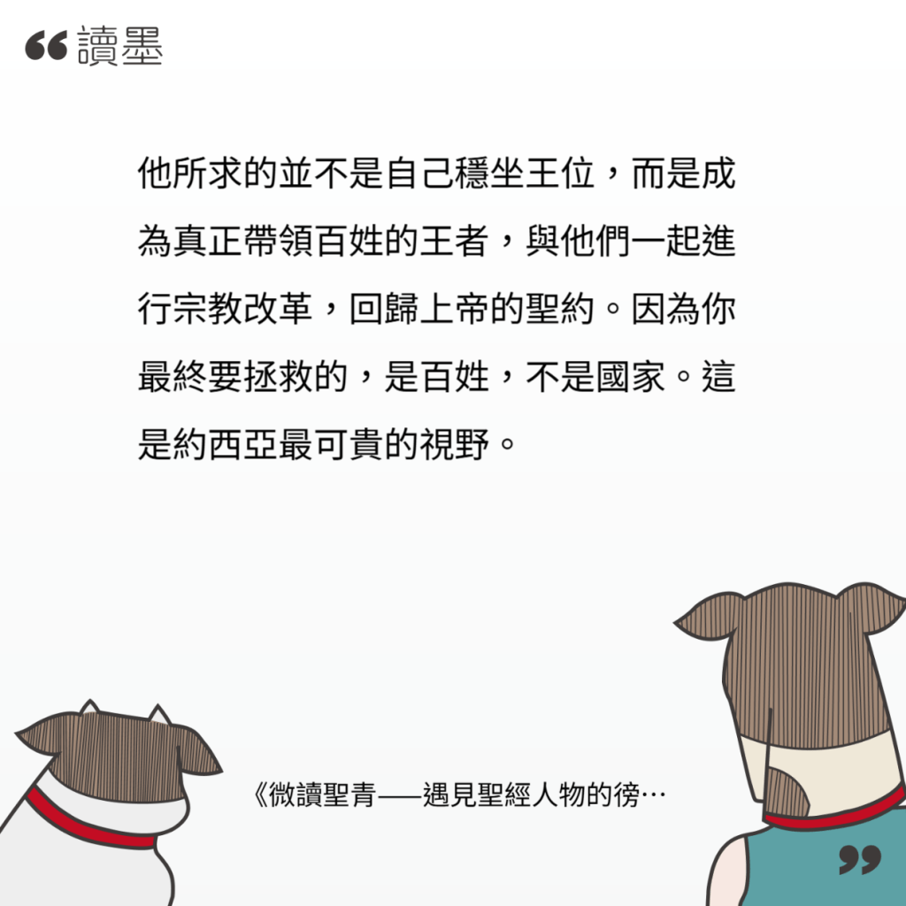 (3)福哥指出約西亞的「視野」頗值得思考。在穩坐王位與帶領百姓回歸聖約之間,約西亞選擇了後者。或許約西亞不只是高展遠矚,更是一位「手段精明的理想派」人士(約西亞不只動用權力更善用民氣)。