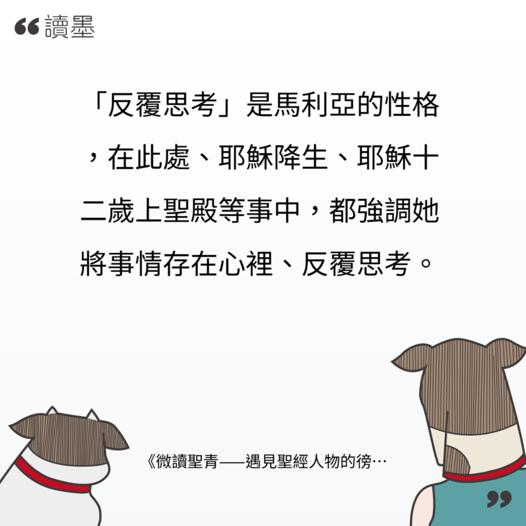 (1)馬利亞到底「反覆思考」了「主和你同在」多久?又得出甚麼結論?其實我覺得基督徒的一生,要是能抓住一個信仰焦點,反覆思辨、體會與實踐,就已經十分可貴。