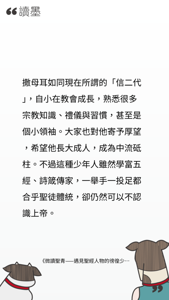 (3)福哥以「乖巧、順服、厚道」形容少年撒母耳真讓我意外,畢竟《微讀聖青》讀到目前的文筆都比較嗆辣而具批判性。我自己可能會改用「穩重/少年老成」來形容撒母耳,他在不甚平靜的環境中穩定成長、堅固自己的信仰、持續聆聽主的指示,直到有一日有能力成為以色列的「國師」。